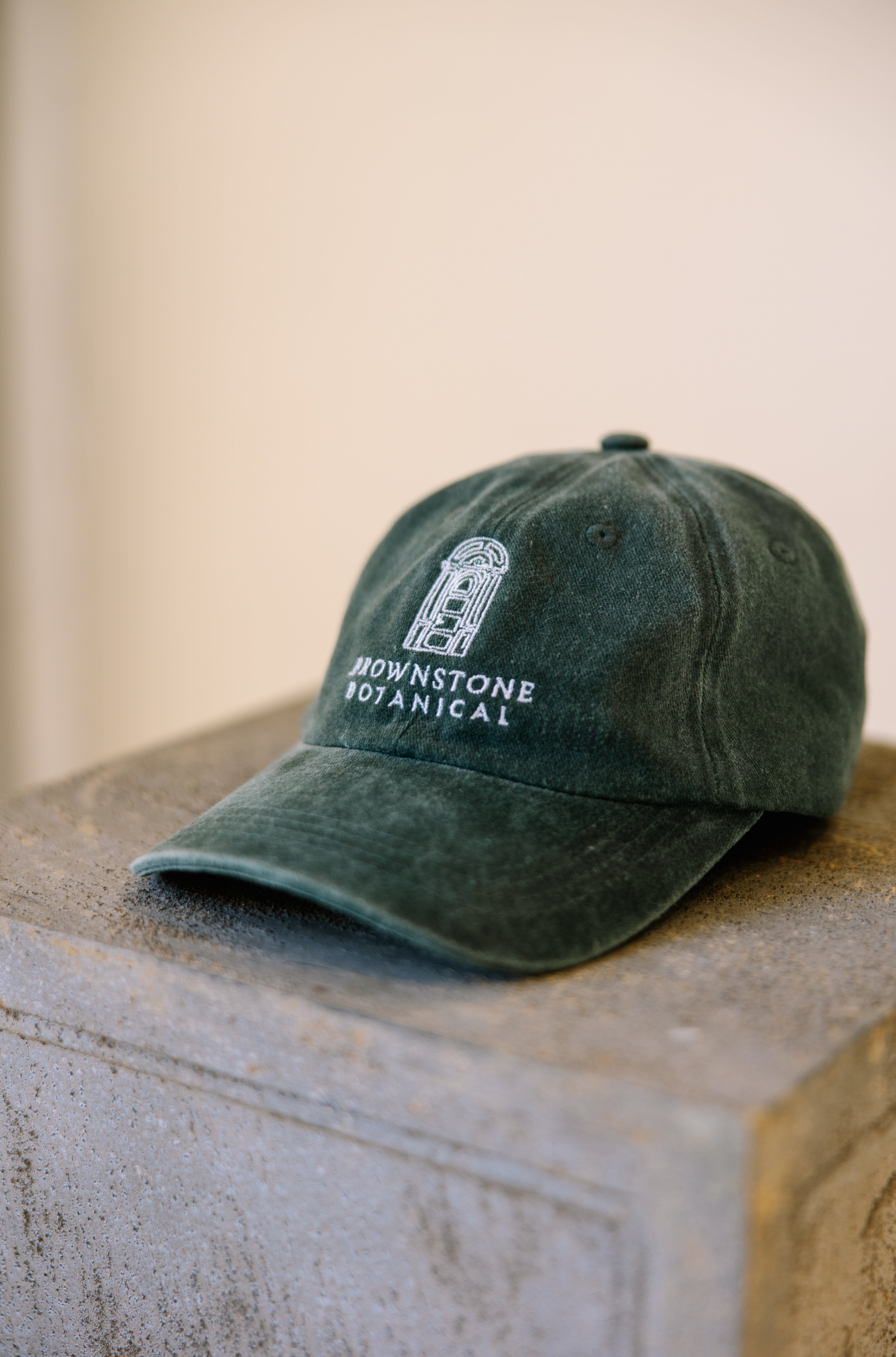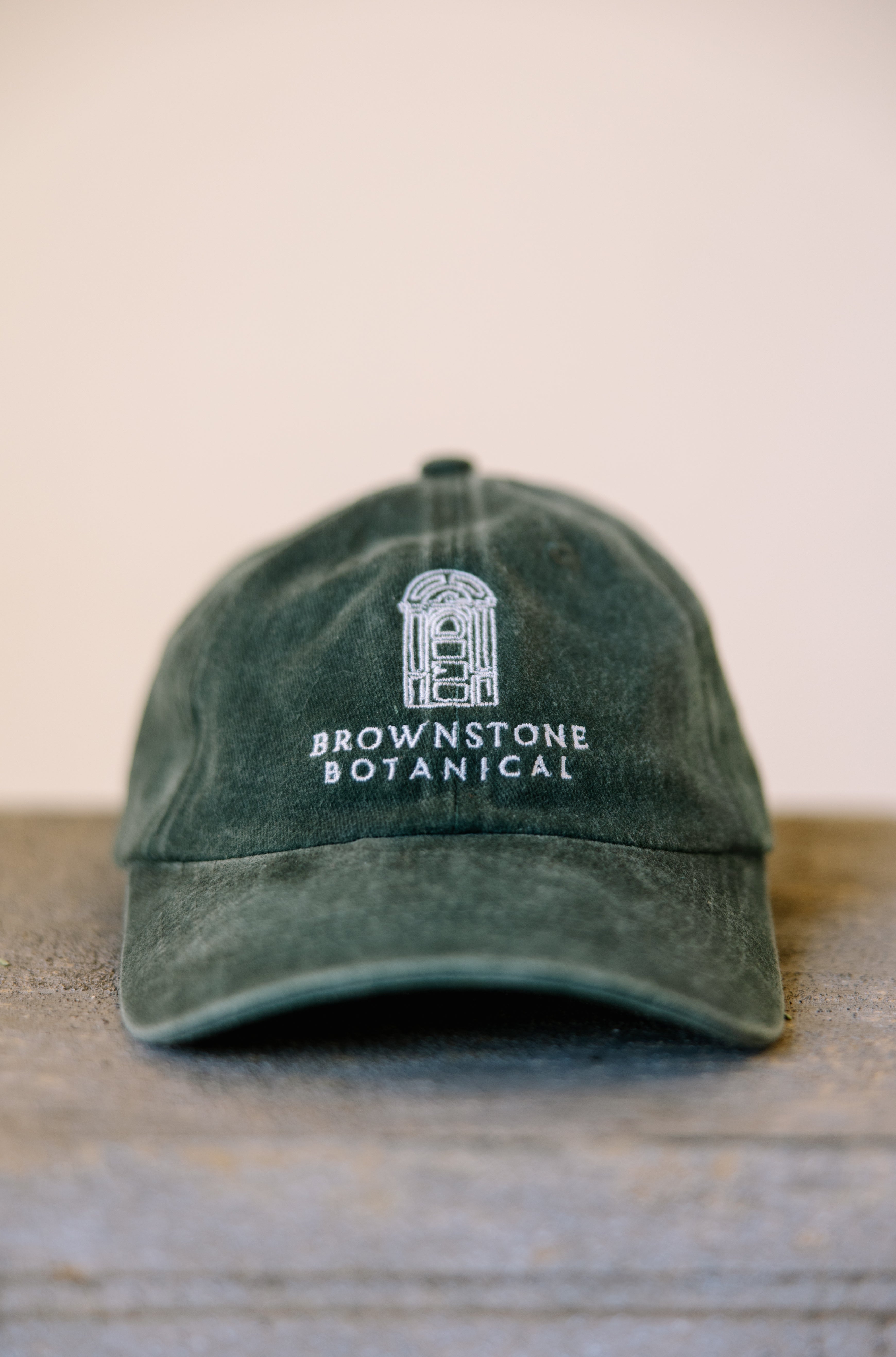 Show your Brownstone Botanical love with this vintage style army green hat featuring the charming Brownstone Botanical logo stitched above the brim. This pre-washed cotton cap has the perfect soft, lived-in look with an adjustable fabric strap with gold buckle.
